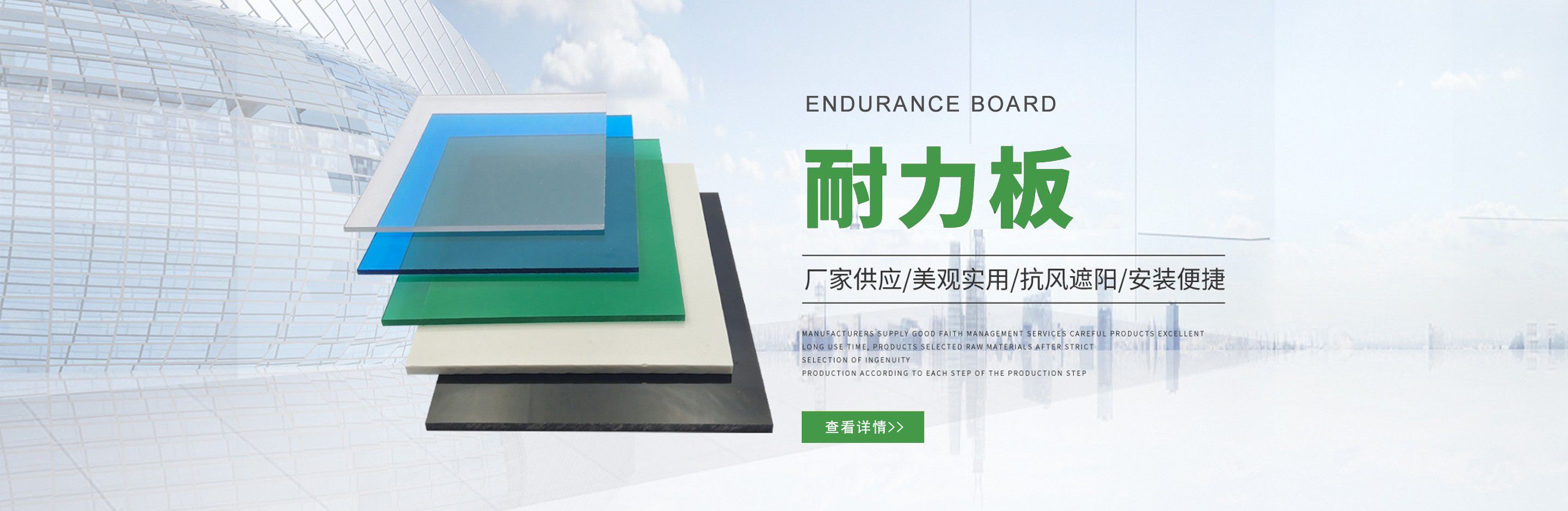 聊城市沐金塑膠有限公司注冊資金2180萬元,占地20000余平方,擁有自建廠房15000平方,員工100余名。10余年來,公司主營耐力板,鎖扣耐力板,耐力板深加工,無動力通風器,組合雨搭,PVC硬脂板,耐力板廠家等板材的發展戰略,逐漸成長為綜合性企業。  公司擁有多條板材共擠生產線,采用世界知名品牌進口原材料和先進工藝,依據完善的ISO9001質量管理體系和ISO14001環境管理體系,為產品的卓越品質提供了強有力的保證。憑借過硬的創新能力和堅實的硬件基礎,贏創已成為國內領先的熱塑性板材生產商,產品被廣泛應用于建筑業、農業、工業、廣告業、安防行業及DIY領域。  公司始終致力于通過提供最優的板材應用解決方案,為客戶創造最高的價值;堅守創新、質量、靈活、服務和速度的核心價值觀;堅持“完美的產品需要完美服務的支持”的經營理念,努力實現成為世界領先的板材與解決方案供應商的夢想。  在未來,公司將立足客戶需求,不斷改變和完善現有產品,拓展產品線和充分開發板材的應用領域,為客戶創造全方位的價值。同時更好地實現員工的價值,實現公司團隊的價值。我們將與您一起創贏未來!  企業使命:成為世界領先的板材與解決方案供應商。  公司愿景:通過提供最優的板材應用解決方案,為客戶創造最高的價值。  核心價值觀:質量...
